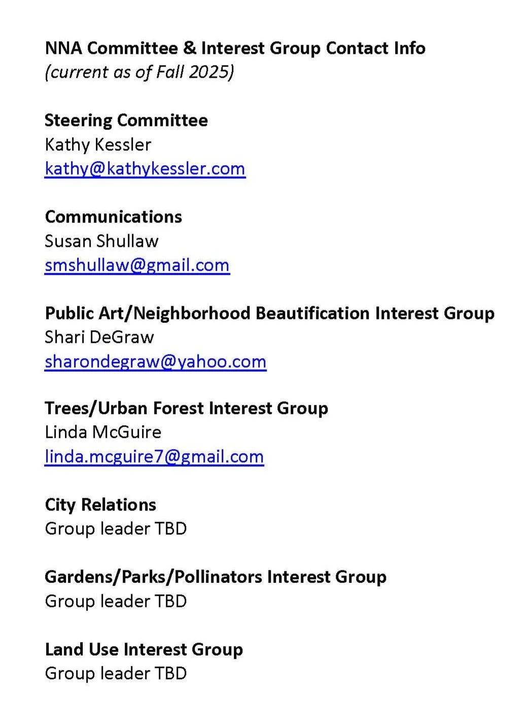 Serves as NNA representative on the City’s Neighborhood Association Council; monitors the actions of City Council and other governmental bodies that may affect the Northside. Meets as needed.